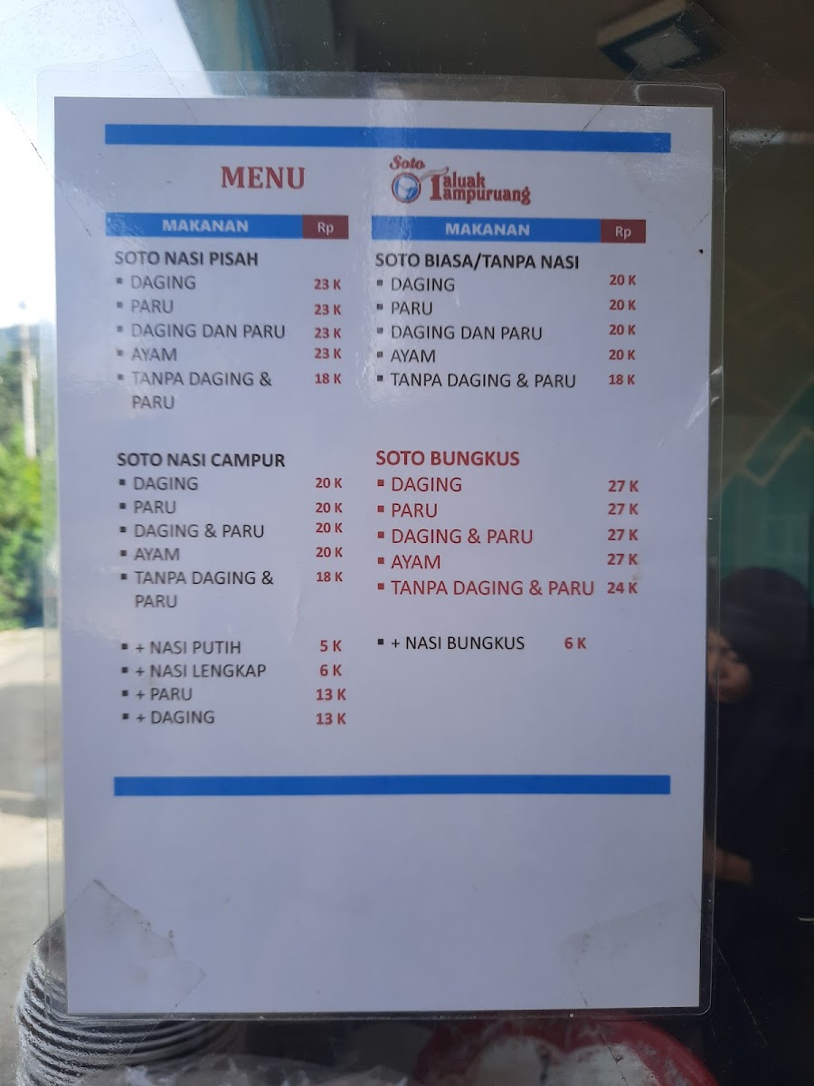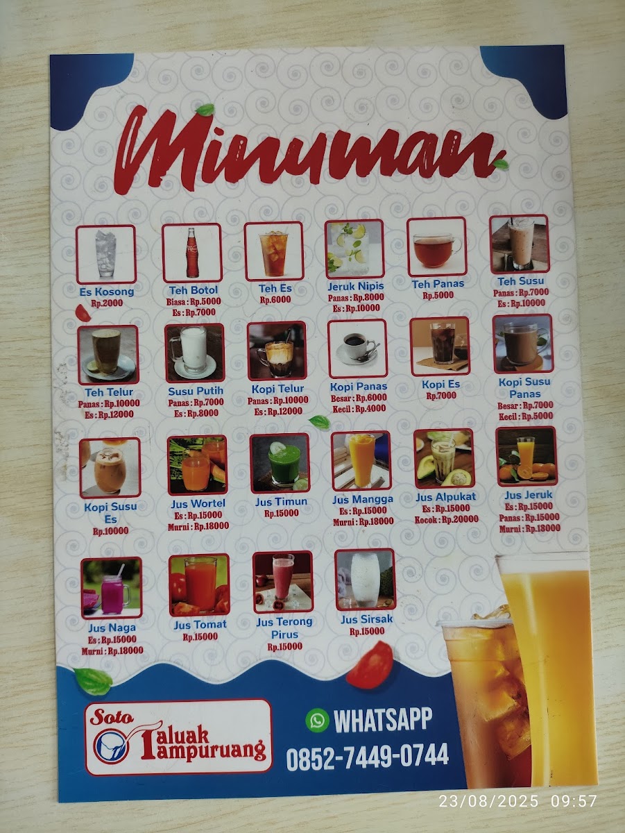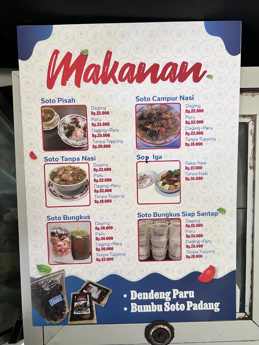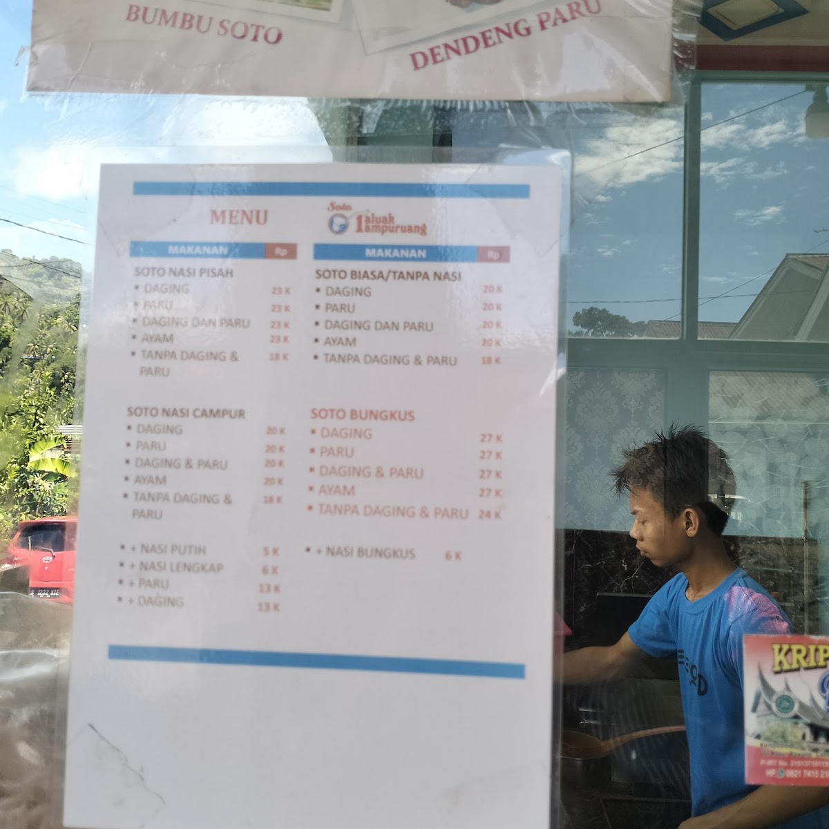 The menu at Soto Taluak Tampuruang Seberang Padang centers on a variety of traditional Soto dishes, a type of Indonesian soup featuring rich broths and assorted proteins. Visitors can expect multiple Soto options including combinations of beef, chicken, and organ meats served with rice or as mixed plates. Complementary items such as salted eggs and fried potato patties (pergedel kentang) are also available. Additional dishes include Sop Iga, a rib soup, providing a wider selection of hearty soups.